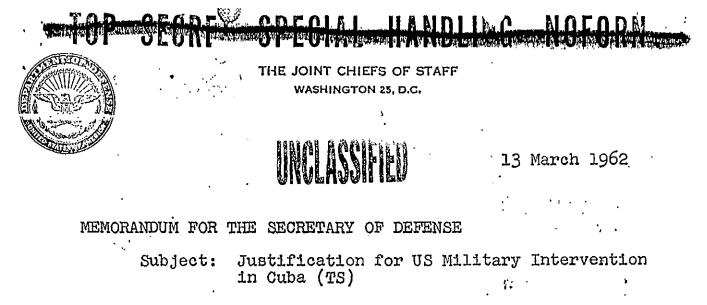 This is a summary of a 13 March, 1962 memorandum from the Joint Chiefs of Staff (JCS) to the Secretary of Defense, Robert McNamara, regarding justifications for US military intervention in Cuba. The plans were motivated by a desire, among military leaders to depose Castro. Castro had seized power a few years earlier to become the first communist leader in the western hemisphere.